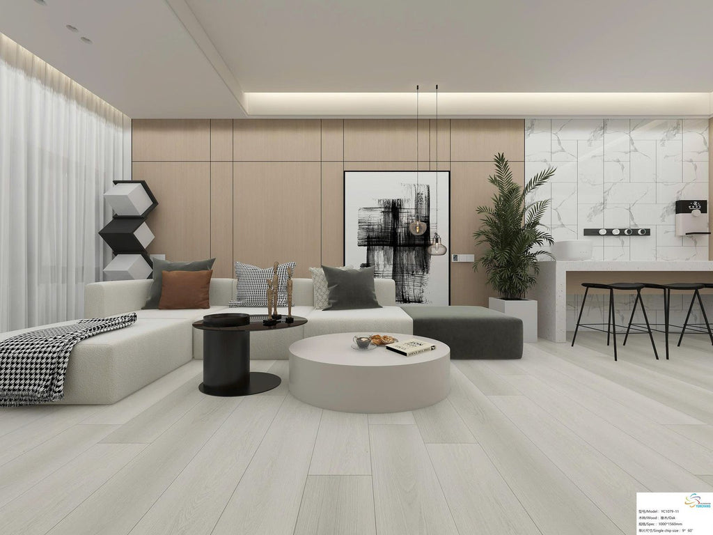 Apex White is a rigid core SPC vinyl plank engineered for waterproof performance and quick installation.