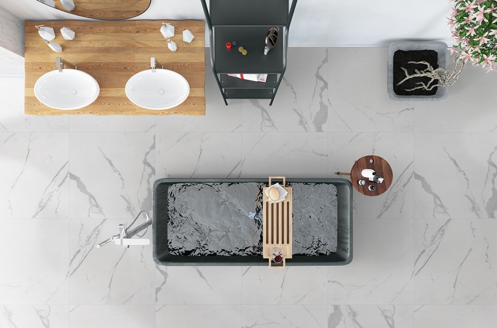 Eden Statuary is a porcelain tile chosen for durability and a clean, modern look.